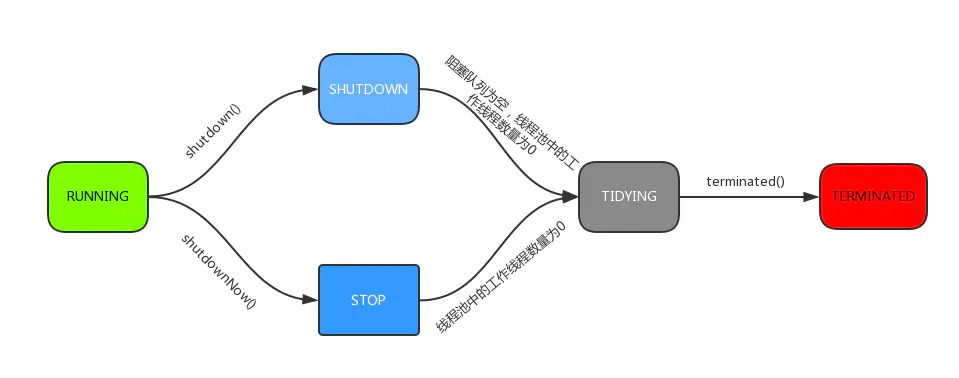 - STOP:不能接受新任务,也不处理队列中的任务,会中断正在处理任务的线程。在线程池处于 RUNNING 或 – SHUTDOWN 状态时,调用 shutdownNow() 方法会使线程池进入到该状态;